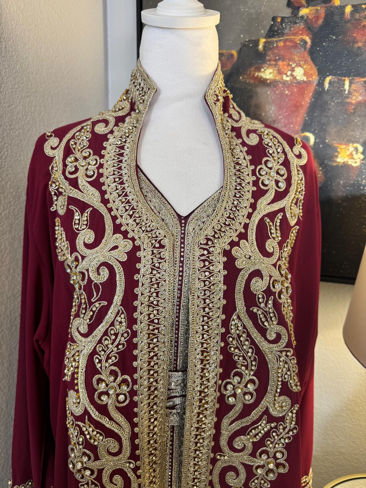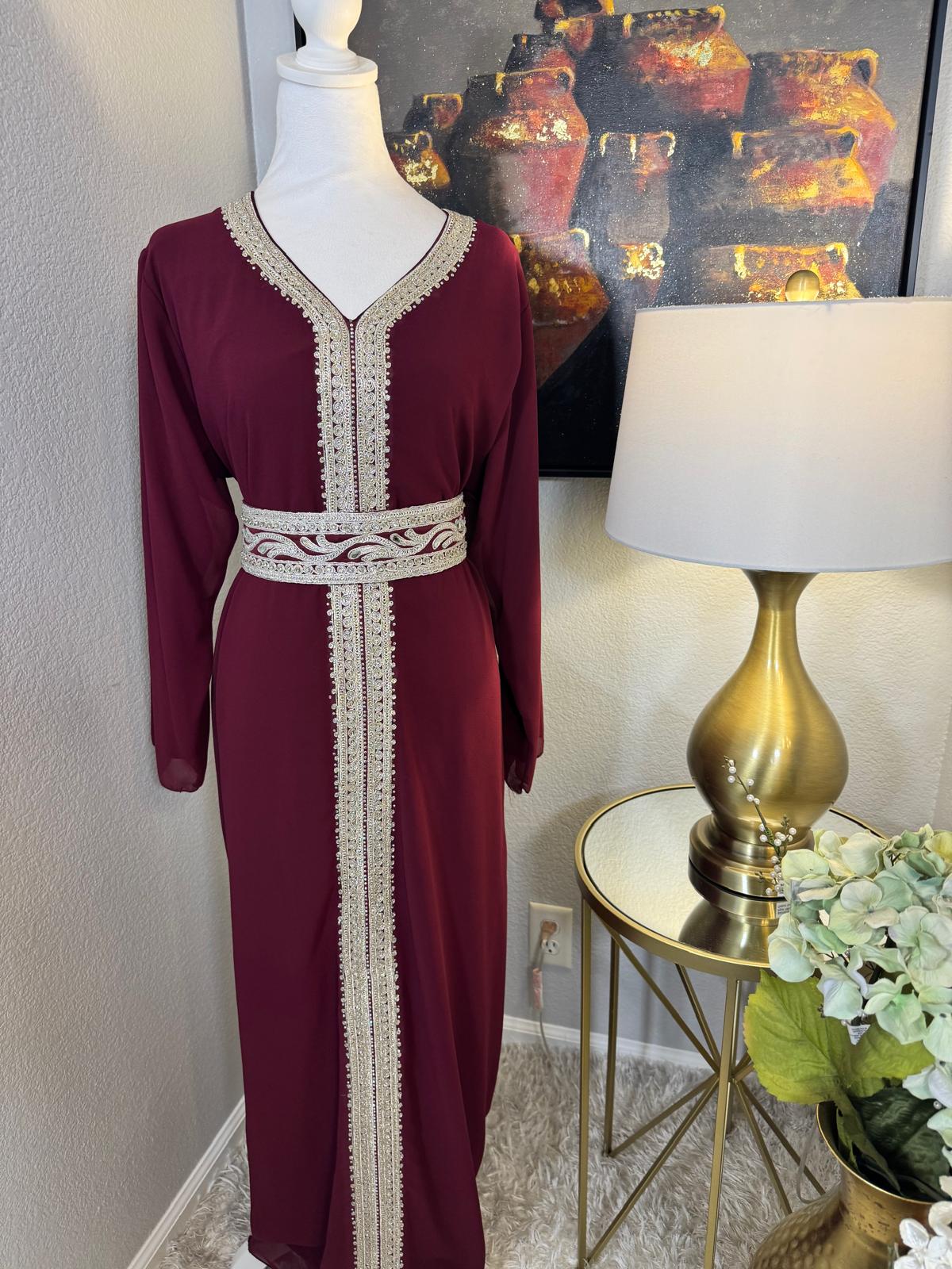 This elegant Hiba Kuftan in a rich maroon hue combines modesty with timeless style.